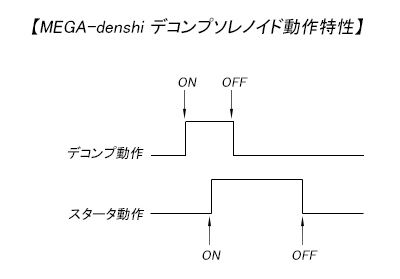 MEGA-denshi CDI では純正デコンプソレノイドコントローラと完全に同じ動作タイミングを実現している為、違和感の無いエンジン始動が可能です。 1、セルスタータスイッチを押すと同時にデコンプソレノイドが動作し、デコンプ開始 2、0.2秒後にマグネットスイッチに電流を流す → セルモータ動作開始 3、デコンプは動作開始から0.5秒後(セルスタータスイッチを押してから0.7秒後)に動作停止 4、セルスタータスイッチを離すとセルモータ停止 ![]() 2、セルスタート誤作動防止機能の搭載
