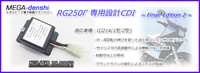 [ヒストリー] 2026年 -------------------------------------------------------------------------------- SEROW225WE (4JG) XT225WE 4JG5, 4JG6専用設計デジタル進角CDI ver.1.0 新発売(3月) ![]() RZ250R-3HM (29L) 専用設計デジタル進角DC-CDI ver.1.0 新発売(2月) ![]() 2025年 -------------------------------------------------------------------------------- CBR250FOUR (MC41) 専用設計デジタル進角イグナイタ ver.1.0 新発売(12月) ![]() TY250ZSスコティッシュ (4ML) 専用設計デジタル進角CDI+オイルソレノイドコントローラ ver.1.0 新発売(11月) ![]() LS650F, U (NP41A) 専用設計デジタル・デコンプソレノイドコントローラ ver.1.0 新発売(8月) ![]() TS125RM, N, P, R, V (SF15A) 後期型専用設計デジタル進角CDI ver.1.0 新発売(8月) ![]() LS650F, U・LS400F, U, P (NP41A・NK41A, NK41B) 専用設計デジタル進角イグナイタ ver.1.0 新発売(6月) ![]() RG200FN・TV200N (NH11A) 専用設計デジタル進角CDI ver.1.0 新発売(3月) ![]() CBR250R (MC19) 専用設計デジタル進角イグナイタ ver.1.0 新発売(3月) ![]() 2024年 -------------------------------------------------------------------------------- DT230 ランツァ (4TP) 専用設計デジタル進角CDI ver.1.0 新発売(12月) ![]() TT250R/Raid (4GY) 専用設計デジタルDC-CDI ver.1.0 新発売(7月) ![]() RG500/400/250Γ (HM31A/HK31A/GJ21B) 専用設計デジタルSAECコントローラ ver.1.0 新発売(6月) ![]() RG250Γ-1型 (GJ21A) 専用設計デジタル進角DC-CDIver.1.0 新発売(6月) ![]() RG250Γ-2型 (GJ21A) 専用設計デジタル進角CDI + エアコントロールユニット ver.1.0 新発売(5月) ![]() RG250Γ-2型 (GJ21A) 専用設計デジタル進角DC-CDI + エアコントロールユニット ver.1.0 新発売(5月) ![]() RG500/400Γ (HM31A/HK31A) 専用設計デジタル進角DC-CDI ver.1.0 新発売(5月) ![]() R1-Z (3XC) 専用設計デジタル進角DC-CDI ver.1.0 新発売(4月) ![]() RA125 (SF13A) 専用設計デジタル進角DC-CDI ver.1.0 新発売(1月) ![]() 2023年 -------------------------------------------------------------------------------- TDR250 (2YK) 専用設計デジタル進角CDI ver.1.0 新発売(11月) ![]() RG125FT, TV125T (NF13A) 専用設計デジタル進角CDI ver.1.0 新発売(10月) ![]() NSR250RJ (MC18) 純正PGM専用デジタルRCバルブコントローラ ver.1.0 新発売(10月) ![]() RZ250R-3HM (29L) 専用設計デジタル進角CDI ver.1.0 新発売(8月) ![]() DREAM 50 (AC15) 専用設計デジタル進角CDI ver.1.0 新発売(7月) ![]() RZV500R (51X) 専用設計デジタル進角CDI ver.1.0 新発売(5月) ![]() RZV500R (51X) 専用設計デジタルYPVSコントローラ ver.1.0 新発売(5月) NSR250RJ (MC18) 専用設計デジタル進角DC-CDI・コントローラセット ver.1.0 新発売(3月) ![]() RGV250J, FJ (VJ21A) 専用設計デジタル進角DC-CDI ver.1.0 新発売(2月) RGV250J, FJ (VJ21A) 専用設計デジタルAETCコントローラ ver.1.0 新発売(2月) MEGA-denshi DC-CDI専用DCコンバータを開発・実用化 (1月) ⇒ AC-CDIを含めたすべてのCDIの開発が可能となる 2022年 -------------------------------------------------------------------------------- RZ250R-1XG専用設計デジタル進角CDI ver.1.0 新発売(11月) RZ250R-1XG専用設計デジタルYPVSコントローラ ver.1.0 新発売(11月) TZR125-3TY専用設計デジタルYPVSコントローラ ver.1.0 新発売(10月) TZR250-1KT専用設計デジタルYPVSコントローラ ver.1.0 新発売(7月) NS400R専用設計デジタルATACコントローラ ver.1.0 新発売(3月) 2021年 -------------------------------------------------------------------------------- RG125FN, P, R (NF13A) 専用設計デジタル進角CDI ver.1.0 新発売(12月) ![]() MEGA-denshi Kill switch Mode select System (M.K.M.S.) を開発(10月) ⇒ キルスイッチを利用して排気バルブの動作モードを選択できるようになる SDR (2TV) 専用設計デジタルYPVSコントローラ ver.1.0 新発売(11月) R1-Z (3XC) 専用設計デジタル進角CDI ver.1.0 新発売(10月) TZR125 (3TY) 専用設計デジタル進角CDI ver.1.0 新発売(8月) MVX250F (MC09) 専用設計デジタル進角イグナイタ ver.1.0 新発売(7月) SEROW225-1KH0 (1KH) 専用設計デジタル進角CDI ver.1.0 新発売(4月) NS250R/NS250F (MC11) 専用設計CDI ver.1.0 新発売(4月) SEROW225-2LN0 (1KH) 専用設計デジタル進角CDI ver.1.0 新発売(3月) NS400R専用設計CDI ver.1.0 新発売(2月) 2020年 -------------------------------------------------------------------------------- TZR250-1KT専用設計デジタル進角CDI (M.V.S.S搭載) ver.1.0 新発売(12月) MEGA-denshi Variable Signal Shield (M.V.S.S.) を開発(11月) ⇒ これによりCDI内部の電子回路をシールドし、より一層正確な信号処理が可能になる ![]() RG250Γ-GJ21B-5型専用設計デジタル進角CDI-Limited 新発売 [限定20個](11月) ![]() SDR専用設計デジタル進角CDI-REIGAⅡ (M.T.P.S.搭載) ver.1.0 新発売(9月) ![]() MEGA-denshi Throttle Posision Sensing (M.T.P.S.) を開発(8月) ⇒ これによりスロットルポジションセンサ無しで3次元点火マップが使用可能になる ![]() RG500Γ/RG400Γ (HM31A/HK31A) 用デジタル ver.1.0 新発売(6月) ![]() KR250用デジタルCDIセット ver.1.0 新発売(5月) ![]() RG250Γ (GJ21A) 用 点火時期進角・遅角可能CDI REIGA-CDI (Revolutionary Incredible Graceful Advanced - CDI) ver.1.0 新発売(5月) ![]() RG250Γ (GJ21A) 用 点火時期進角・遅角可能CDI REIGA-CDI (Revolutionary Incredible Graceful Advanced - CDI) を開発・発表(2月) ![]() CB250RS (MC02) 専用CDI ver.1.0 新発売(2月) ![]() RG250Γ (GJ21B) 用CDI プレミアムゴールド Limited 新発売 [限定30個](1月) ![]() 2019年 --------------------------------------------------------------