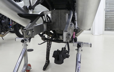 | スイングアーム内部を洗浄し、各リンク部の増し締め等を実施している様子です。 |