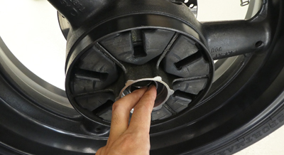 | 点検整備の完了したホイールにスプロケットハブを取り付け、ロックナットを規定トルクで増し締めしている様子です。 |