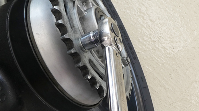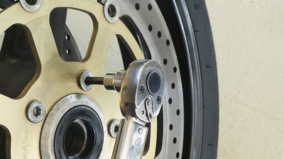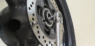 | リヤブレーキディスクの取り付けボルトを規定トルクで増し締めしている様子です。 |