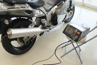 | 継続検査(車検)を受ける前に排気ガスの濃度を測定している様子です。CO, HC ともに基準値を大きく下回っていて状態は良好であることを確認しました。 |